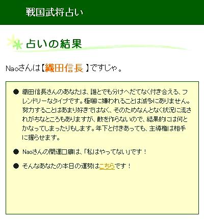 ● 今日は巷で話題な戦国武将占いに挑戦してみました。何種類かあるみたいですが、今回やったのは単純に名前と生年月日、血液型で診断するタイプの占いです。